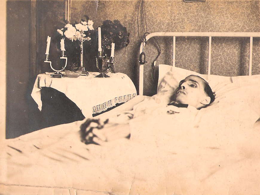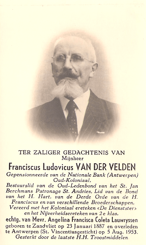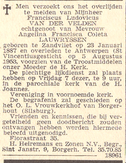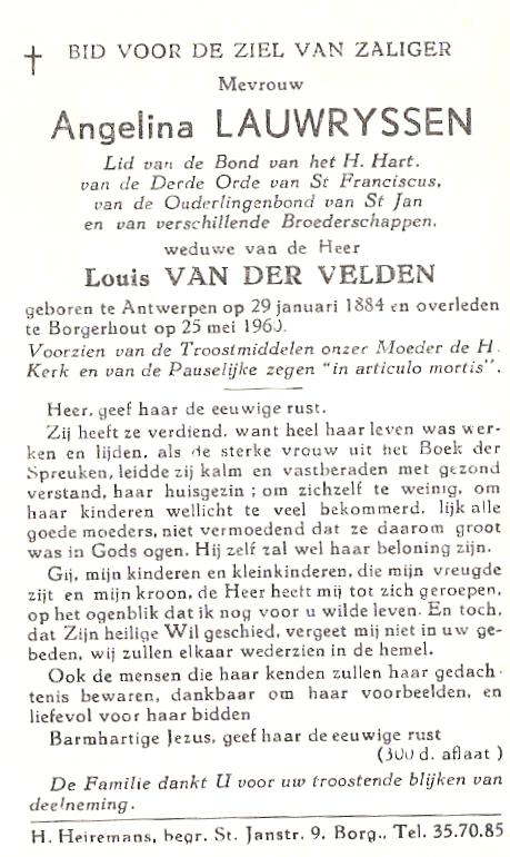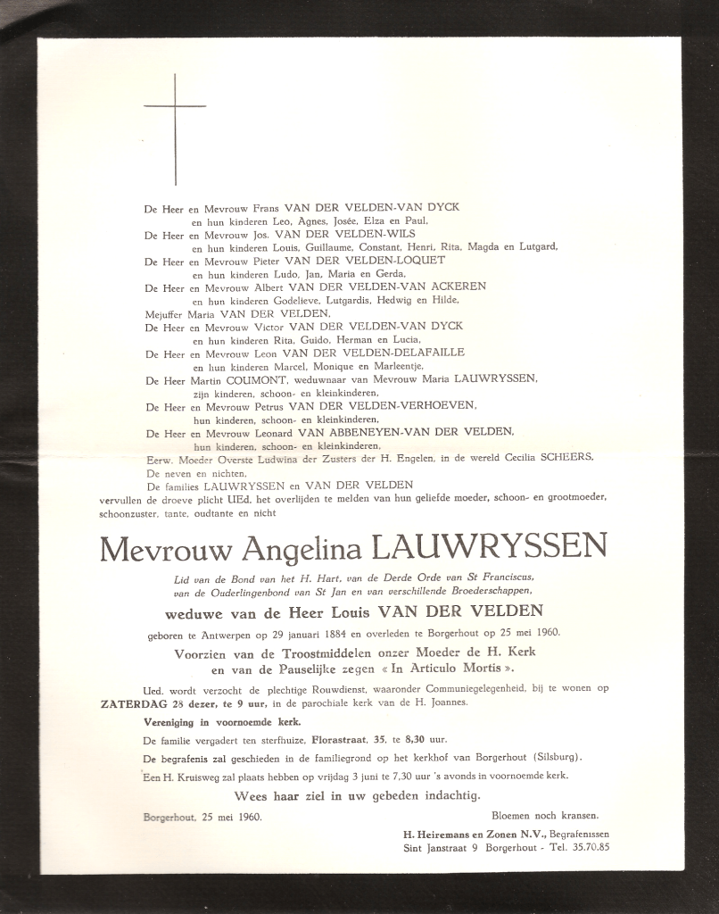 Onze grootouders hebben we nog gekend: grootvader Franciscus Ludovicus Van der Velden en grootmoeder Angelina Lauwryssen. Er komt al een aankondiging in de krant. Foto’s, met voor grootvader aan de voorkant al alle belangrijke zaken: een kort overzicht van zijn leven en ook van zijn kerkelijk leven. Op de achterzijde blijft het godvruchtig en er vallen nog altijd 300 dagen aflaat te verdienen. De begrafenisondernemer Heiremans zal de laatste tocht van vele familieleden begeleiden.