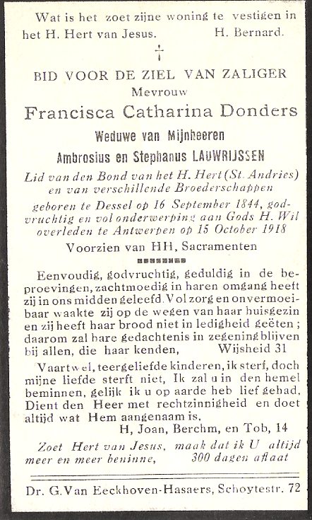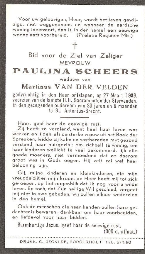 Er is een hele evolutie in bidprentjes: we beginnen bij 2 overgrootmoeders langs de Van der Veldenkant: Francisca Catharina Donders en Paulina Scheers. Ze waren beide sterke vrouwen, letterlijk en figuurlijk: dit wordt zelfs op het prentje van Paulina vermeld. Ze overleefden hun echtgenoot – Francisca zelfs 2 – en kregen elk 7 kinderen! Alhoewel Francisca vroeger stierf is er al een foto: aan haar kledij herken je duidelijk haar kempische roots. De tekst op de achterzijde van de prentjes is zeer godvruchtig en men kan nog 300 dagen aflaat verdienen! (zo lang na Luther!)