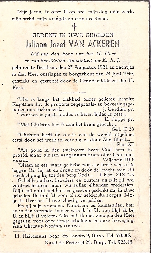 Van de ene familie en de ene begrafenisstoet naar de andere. Mijn oom Juliaan Jozef Van Ackeren stierf zeer jong; ik heb hem nooit gekend. Er werd een foto van het sterfbed genomen; ons moeke had zelfs een broche met zijn foto. Julien was kajotter; dat wordt extra benadrukt op het bidprentje met woorden van Jozef Cardijn en priester Poppe. Er was een indrukwekkende begrafenisstoet, zeker als men er aan denkt dat het in volle oorlog plaats vond.