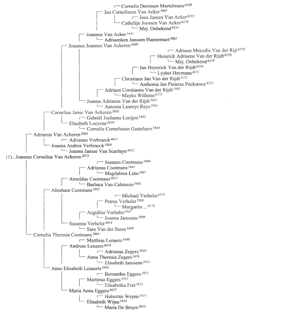 Ik zei al dat het heel vrouwelijk was. We stammen namelijk af van zijn dochter Cathelijn, geboren in Wouw in 1569 en gestorven in juli 1643. Ze ligt begraven in de kerk van Wouw voor het altaar van de H. Sebastianus. Dat toont aan hoe belangrijk de familie was. Ja maar, hoor ik u al denken, hoe komen jullie dan aan die naam Van Ackeren, een onecht kind misschien? Nee. Ze huwt Cornelissen Denissen Martelmans. Twee van hun zonen nemen echter ter ere van hun moeder de naam Van Acker aan. Wij stammen af van Jan Cornelissen Van Acker.